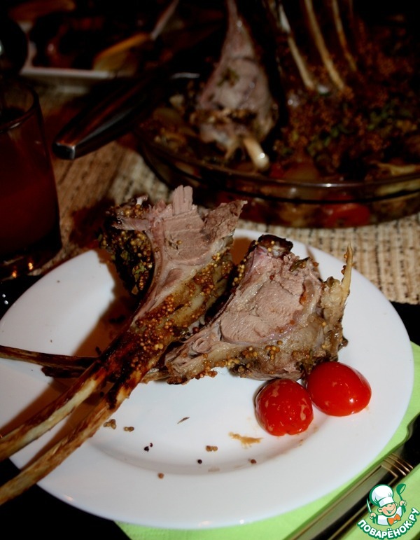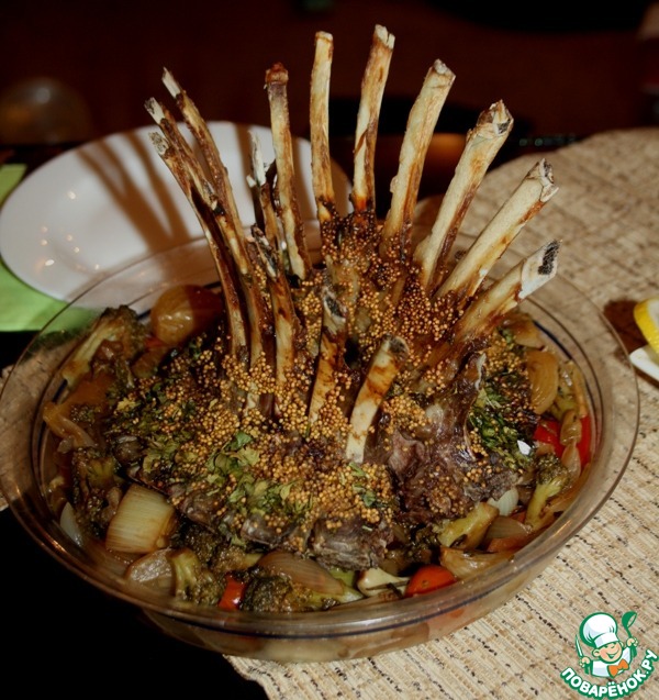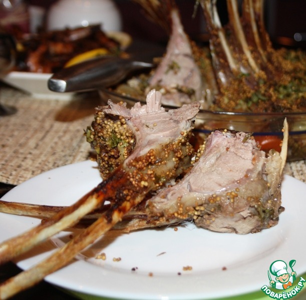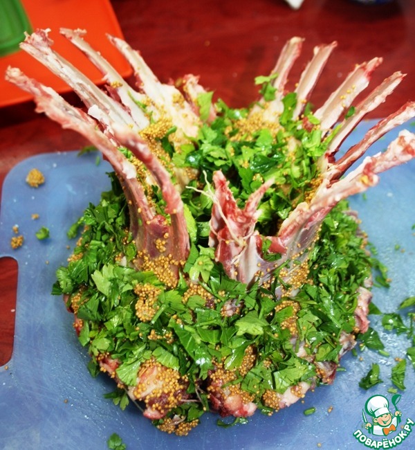 Посолите. Зернами горчицы обмажте корону толстым слоем и обсыпте нашинковоной петрушкой.