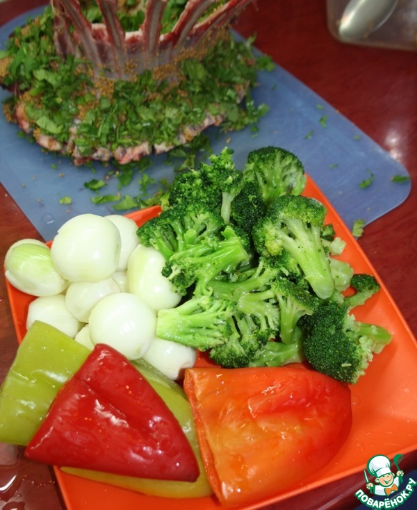 Подготовте овощи для гарнира. Броколи разбирите на соцыетия, очистите перец, морковь, лук, чеснок.