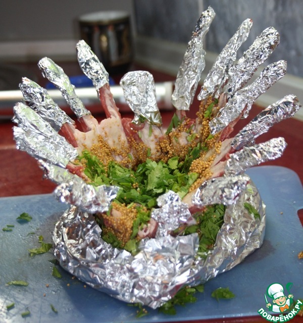 На противень уложите лист фольги. Концы ребер и основание «короны» оберните фольгой.