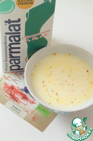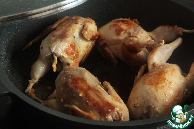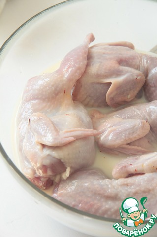 Перепелку выложить в глубокую посуду и залить шафрановым молоком. Оставить на 10 минут.