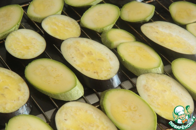 Цуккини и баклажан нарезать ломтиками, сбрызнуть оливковым маслом, посолить, поперчить и выложить на решетку. Запекать в духовке 10 минут при температуре 200 градусов, еще 10 под грилем при той же температуре.