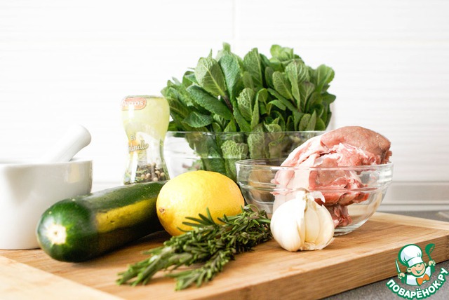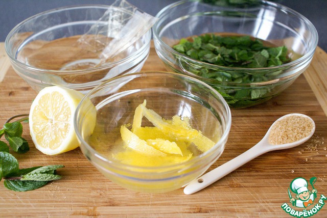 Приготовить соус: замочить желатин в холодной воде. Снять с лимона цедру и выжать сок. БольшУю горсть листьев мяты залить яблочным уксусом, дать настояться.