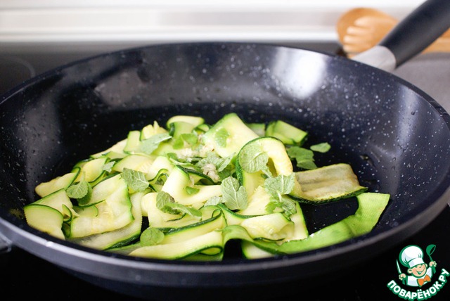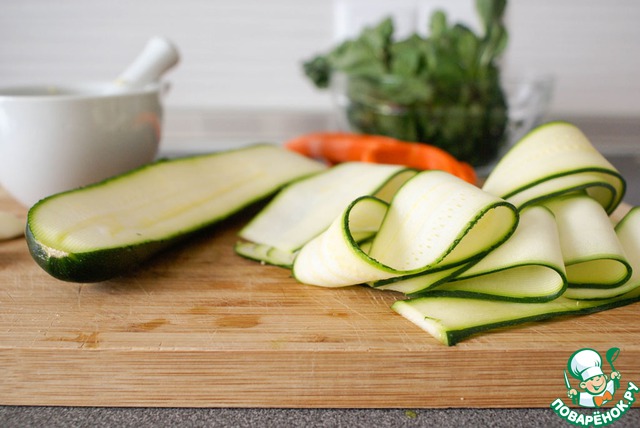 Приготовить гарнир: цукини нарезать с помощью овощечистки на тонкие ленточки.
