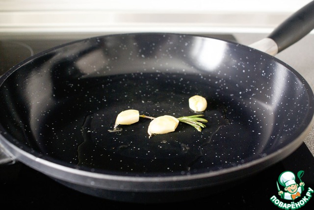 Обжарить на сковороде в разогретом оливковом масле зубчики чеснока и веточку розмарина, до золотистого цвета и появления характерного аромата.