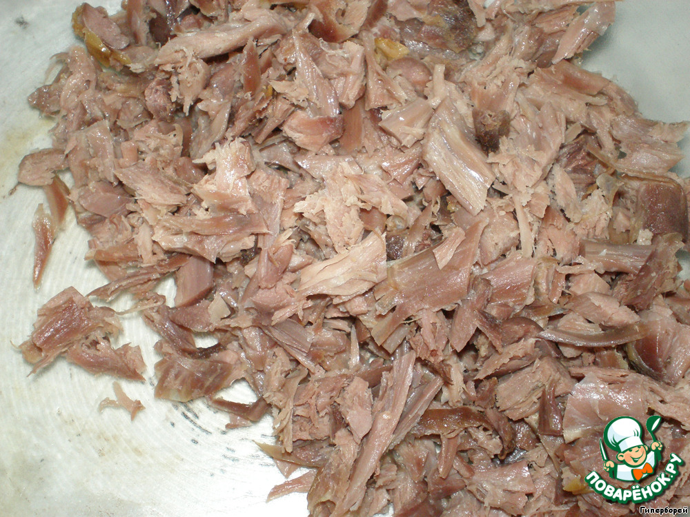 Отваренное утиное мясо нарезать и уложить в посуду.