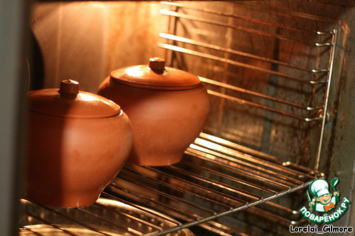Бульон уже разморозился к тому времени, я залила его и немного грибной воды. Все утрамбовала в горшочках (жидкость должна хорошо покрывать). Духовка уже была разогрета до 150 градусов, температуру оставила такую же, горшки отправила на 1 (час):45 (сорок пять) минут