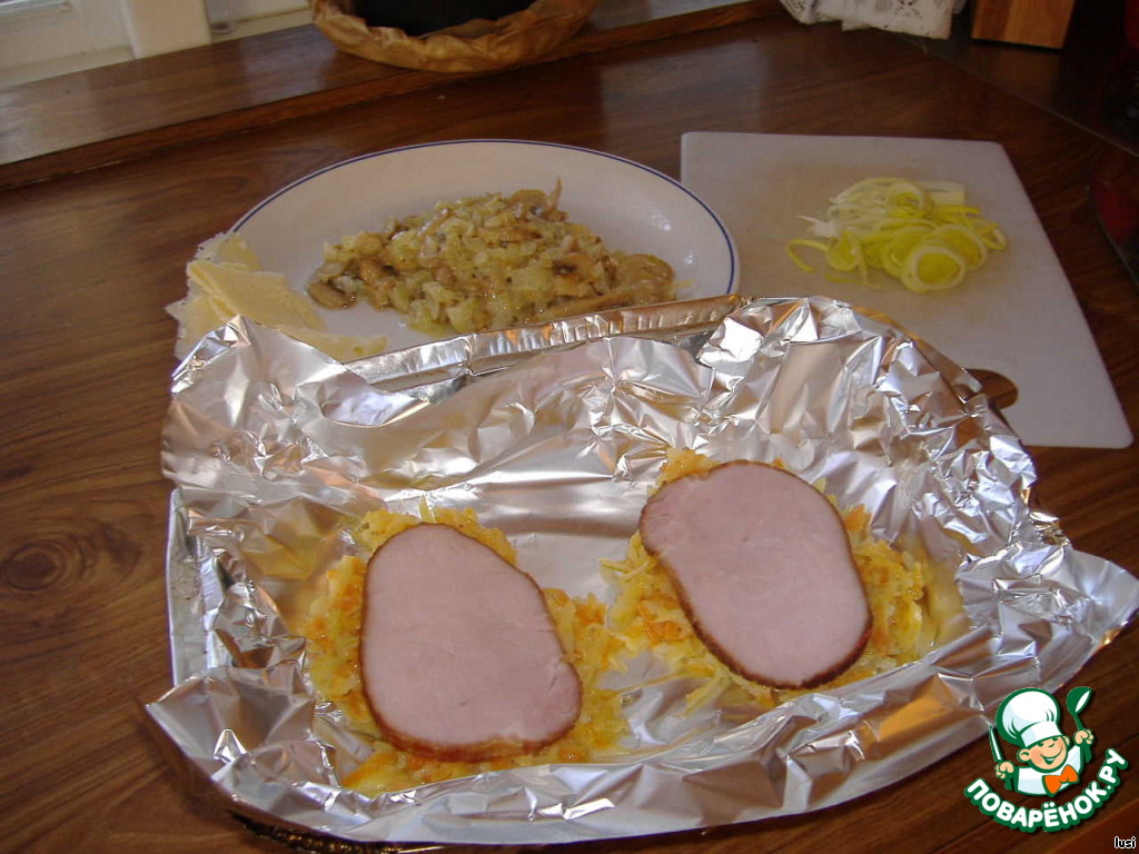 3) Отрезала 2 кусочка ветчины, подготовила форму из фольги.