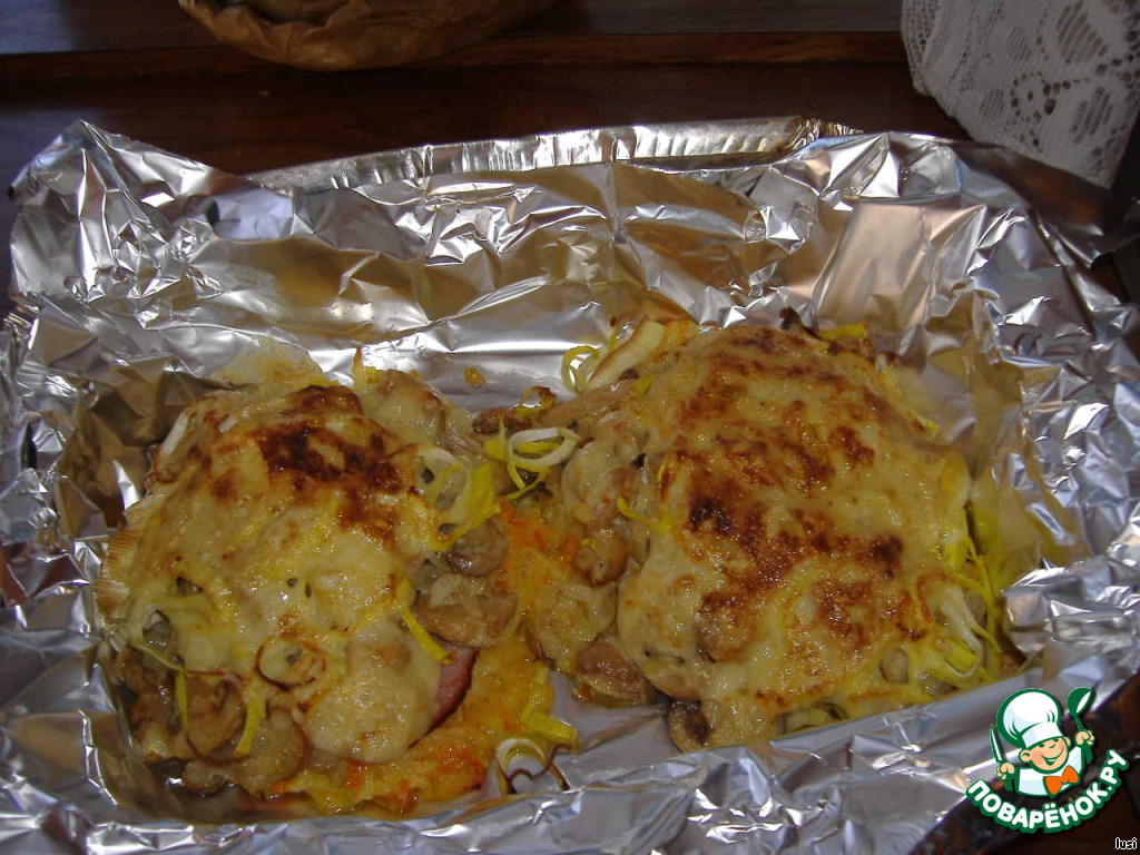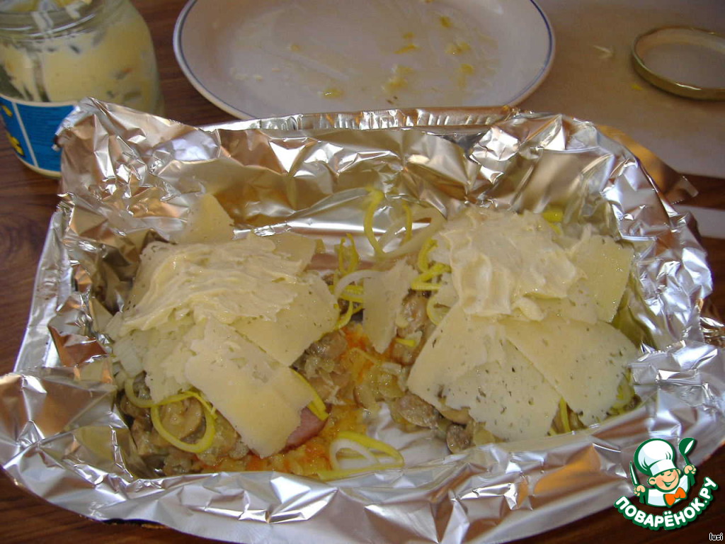 укрываю все это кусочками сыра, слегка смазываю майонезом и ставлю в духовку под гриль.