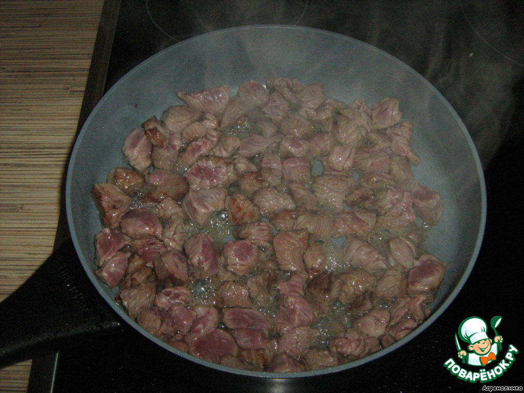 Говядину порезать на мелкие кусочки (пыталась квадратиками). Обжарить на сильно разогретом оливковом масле до румяной корочки.