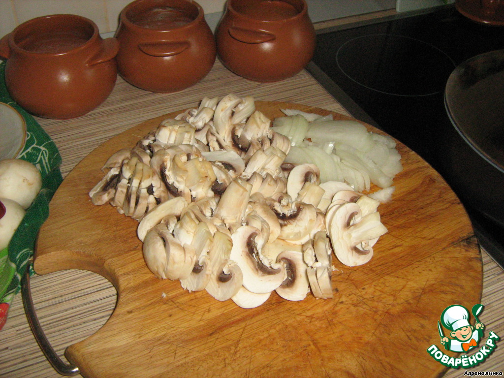 Пока тушится мясо, мы успеваем нарезать лук полукольцами, грибы слайсами.