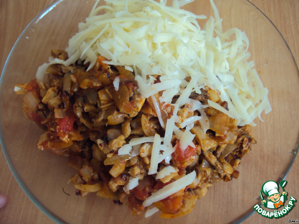 В готовую зажарку добавляем немного сыра и всё хорошенько перемешиваем.