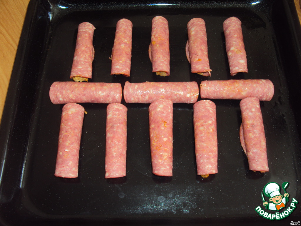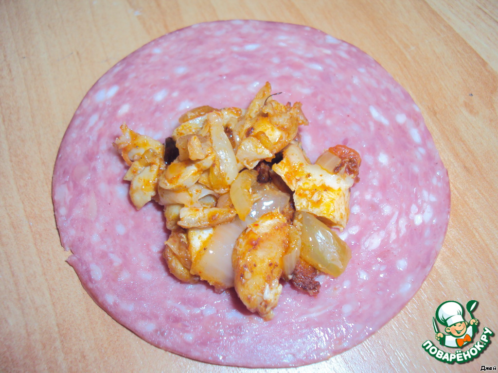 Теперь приступаем к самому интересному - на кружочек колбасы выкладываем по 1 ч.л зажарки и скручиваем всё рулетиком.