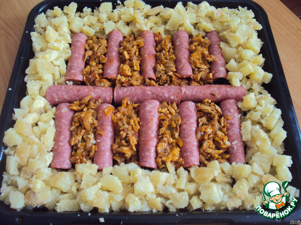 Прикроем наши рулетики оставшейся картошечкой и отправим всё в разогретую до 180-200гр. духовку на 40-45мин. По желанию можно залить картошку небольшим количеством бульона.