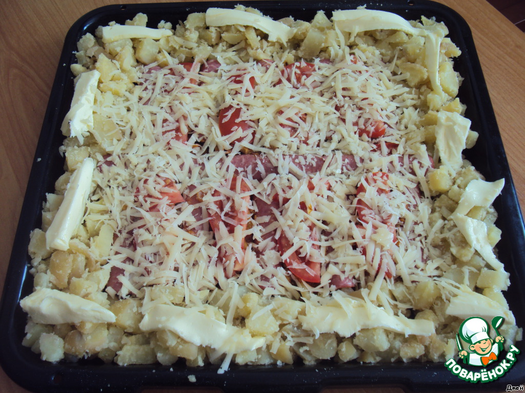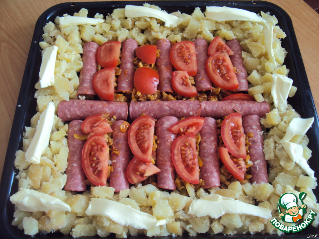 Сверху на картошку кладём кусочки сливочного масла, а на зажарку - дольки помидор.