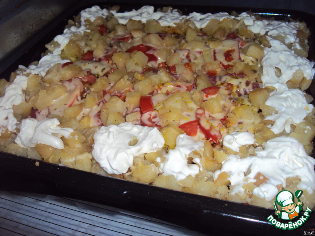 Примерно минут через 20 картошечку покрываем сметаной и снова отправляем всё в духовку.