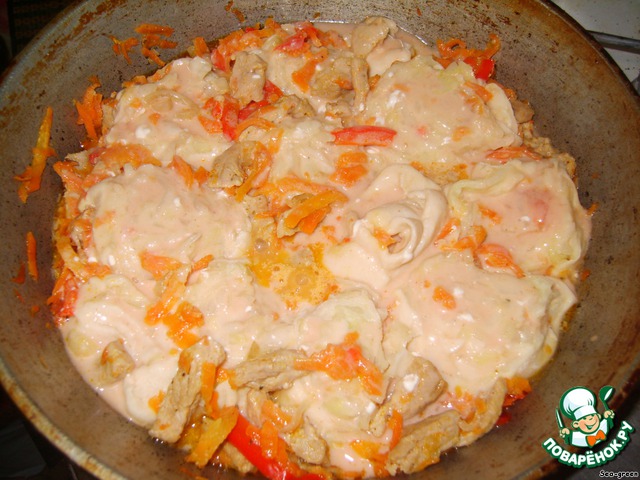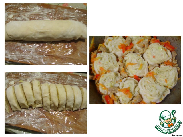 Затем аккуратно свернуть в рулет, нарезать небольшими кусочками и выложить в сковороду поверх овощей с мясом.