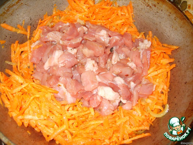 Затем к нему высыпать морковь, немного потушить и добавить приправленное мясо.