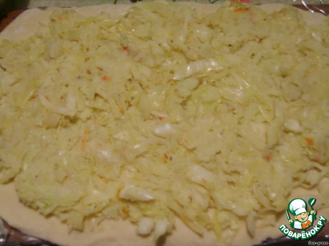 Готовое тесто тонко раскатать и выложить на него ОСТЫВШУЮ начинку из капусты и картофеля.