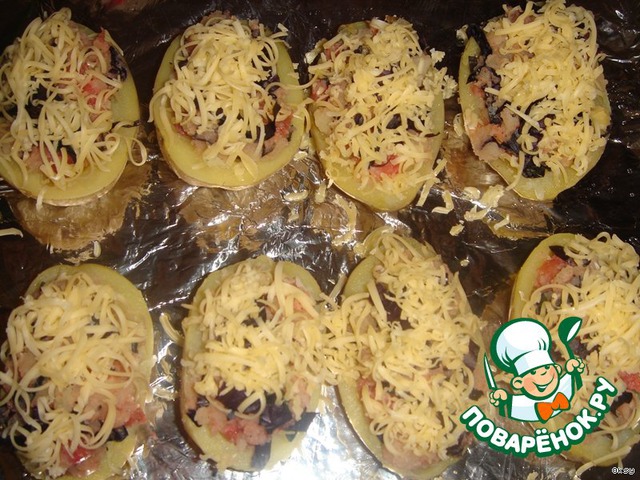 Полученной смесью начинить половинки картофеля, уложить их на смазанный маслом противень.