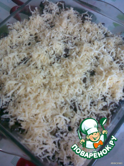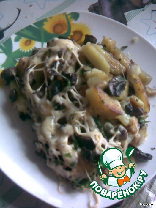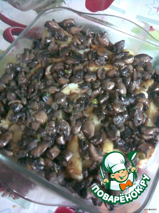 если делать в духовке, то картошку и грибы подготавливаются до полуготовности. И в духовку минут на 15. Посыпать зеленью.