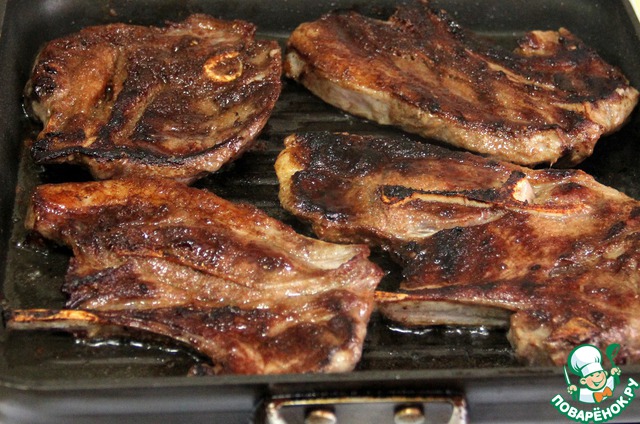 В идеале эти отбивные лучше всего готовить на гриле. Но у меня к сожалению его нет, поэтому я использую сковороду-гриль. Сковороду хорошо нагреваем, наливаем немного масла и обжариваем отбивные с каждой стороны примерно по 5 минут.