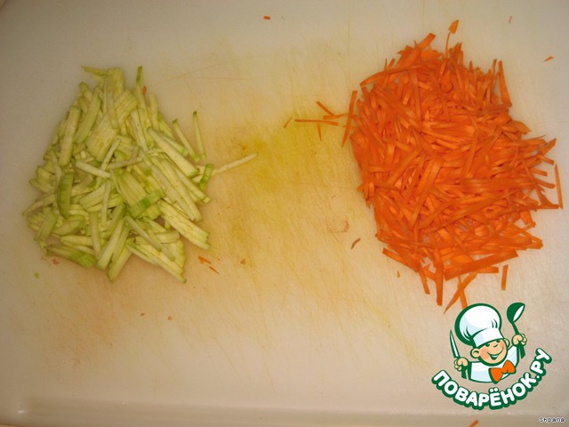 Пока тушится мясо, нарезаем тоненькой соломкой морковку, цуккини.