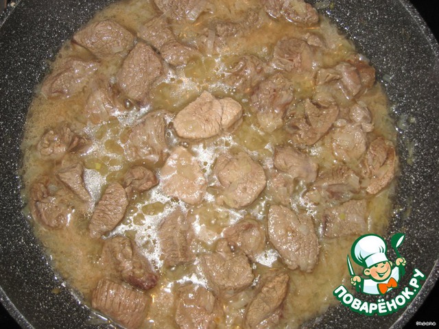 Затем добавляем мясо, перемешиваем, накрываем крышкой, делаем минимальный огонь и тушим до мягкости мяса. Примерно 1,5 часа. Может уйти и больше времени, все зависит от мяса.