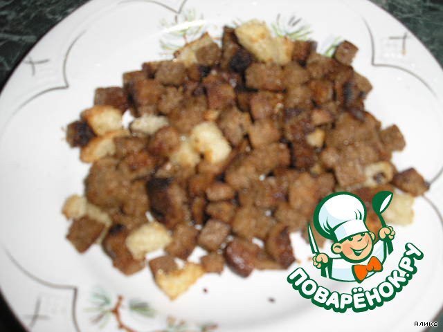 Сливочное масло растопить на сковороде и обжарить хлеб на среднем огне. Нужно постоянно помешивать, так как сливочное масло имеет свойство гореть. Выложить сухарики на тарелочку.