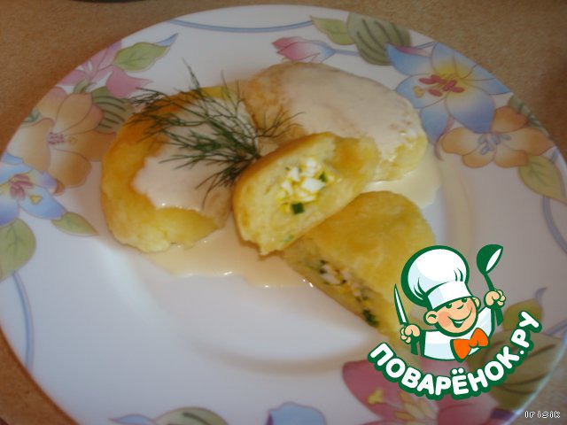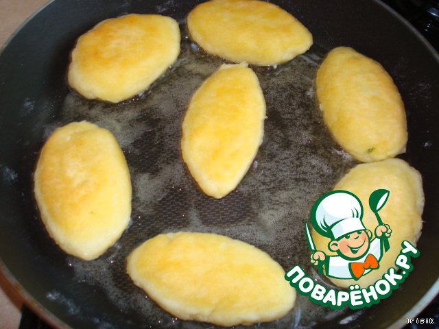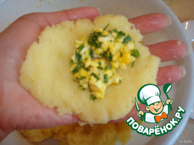 Из картошки делаем на ладони лепешку и кладем на нее начинку.