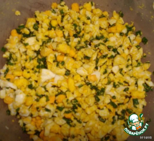 Для начинки зеленый лук мелко режем, вареные яйца рубим. Солим и хорошо перемешиваем.