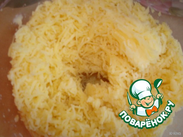 Отваренный в мундире картофель чистим и натираем на мелкой терке. Добавляем яйцо, солим.