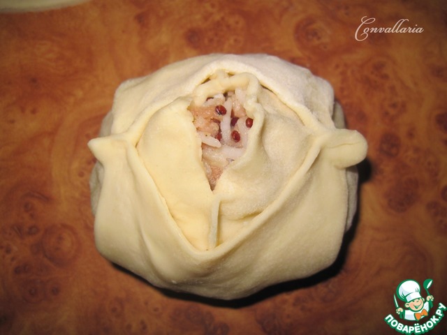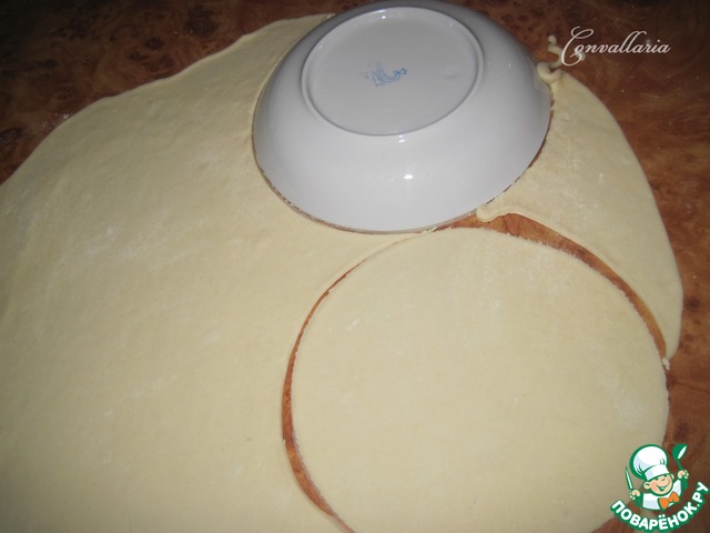 В центр каждого круга выложить по 2 ст. л. приготовленной начинки, скрепить противоположные края теста, оставляя в центре отверстие.