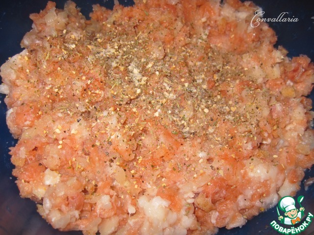 Филе рыбы и репчатый лук прокрутить через мясорубку, добавить специи для рыбных блюд, молотый перец и соль по вкусу.