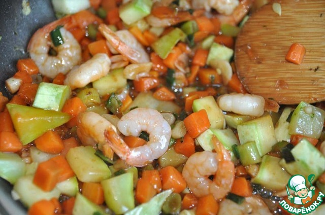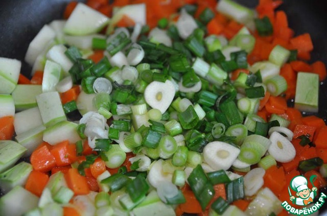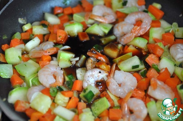 Морковь и цуккини нарезаем кубиками и обжариваем 5 минут на смеси растительного и кунжутного масла.