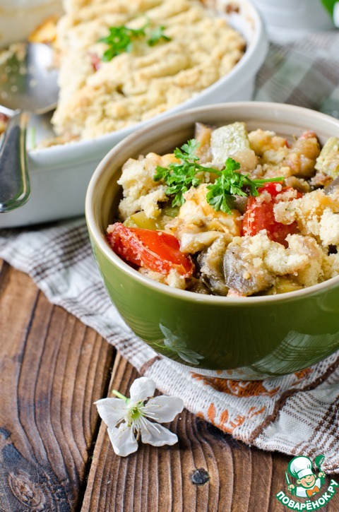 Муку поместить в чашу процессора, добавить охлажденное масло, нарезанное кубиками, и измельчить в импульсном режиме, чтобы получилась крошка. Выложить ее на овощи.