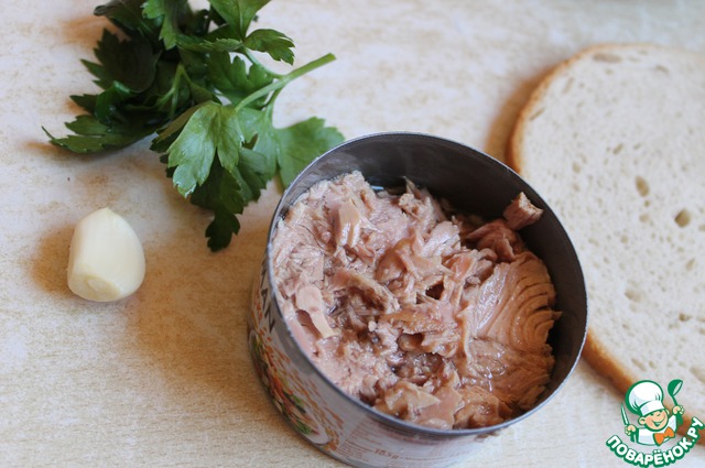 Займемся начинкой. Для этого нам нужен тунец в масле, немного зелени, зубчик чеснока и ломтик хлеба.