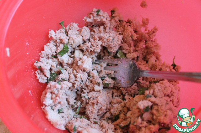 Перемолоть нужно консервы с хлебом и добавить толченый чеснок, зелень резаную. Все перемешать.
