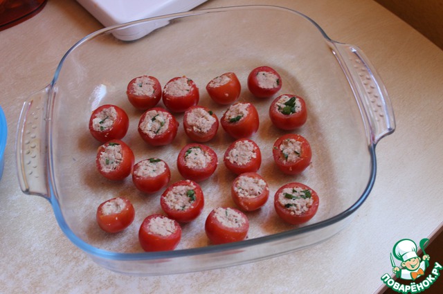 Наполним теперь наши помидорки кофейной ложечкой, и уложим сразу их в форму.