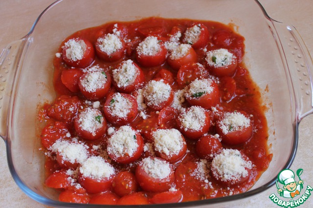 Серединки помидорок нужно размять, посолить, поперчить. Я еще добавила верхушки срезаных помидорок и 2 ложки помидоров в собственном соку. Все выливаем в форму. А помидорки посыпаем сверху пармезаном. Ставим в духовку на 15минут при 190гр.