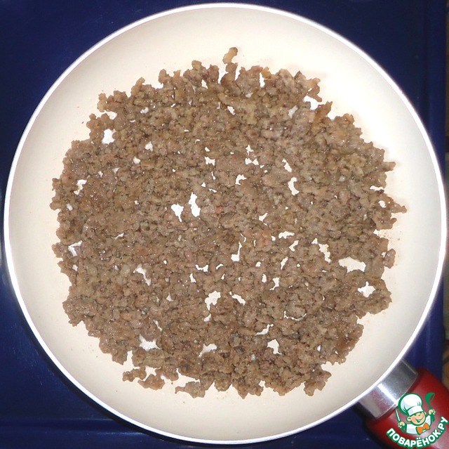 Далее на рисовый корж выложить ранее приготовленный фарш с овощами.