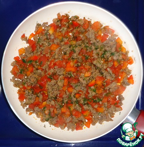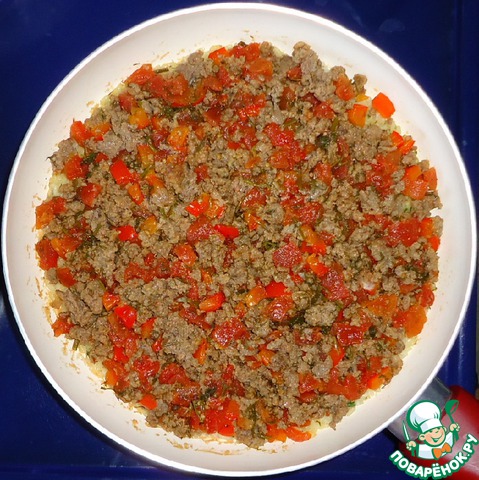 Помидоры и половину перца мелко нарезать, чеснок пропустить через пресс, зелень мелко нарезать и добавить к фаршу, посолить, перемешать. Тушить на медленном огне 10 минут, накрыв крышкой.
