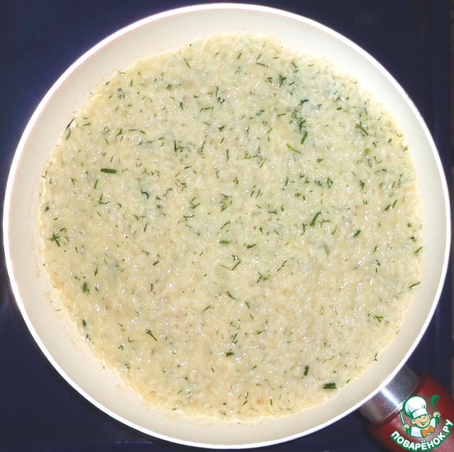 Посыпать тёртым сыром и зеленью, накрыть крышкой, оставить на медленном огне до полного расплавления сыра.