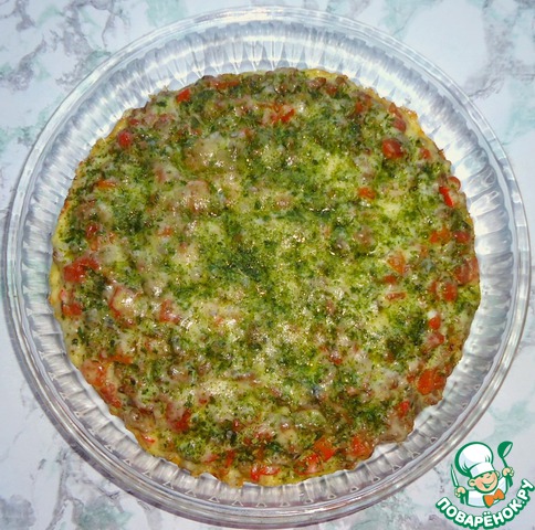 Готовую пиццу легко вынимать из сковороды на блюдо, я выложила пиццу в стеклянную форму.
