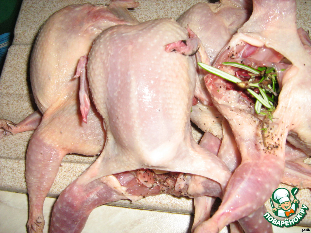 Перепелов хорошо моем, общипываем перышки. Внутри (без внутренностей) солим, перчим, начиняем чесночком и ароматными травами (лавровый лист, розмарин, тмин, шалфей).