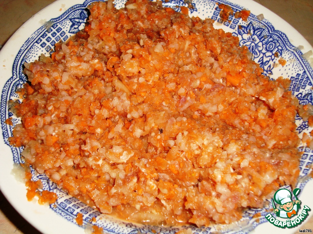 Мясо, морковь, сельдерей перемолоть на мясорубке. Обжарить лук и перемешать с фаршем. Посолить, поперчить.