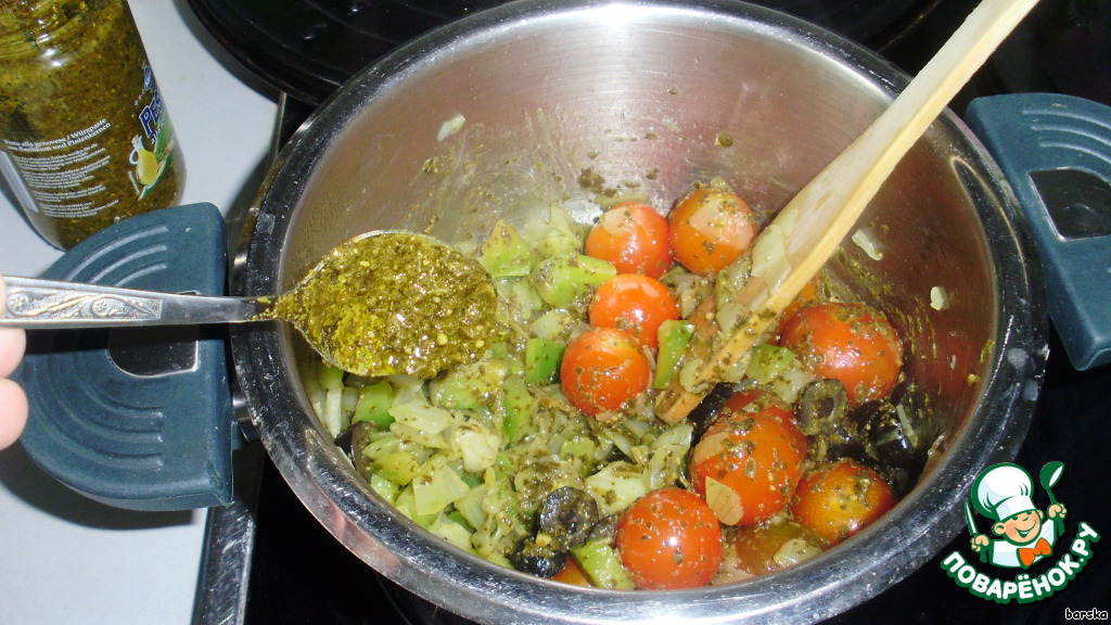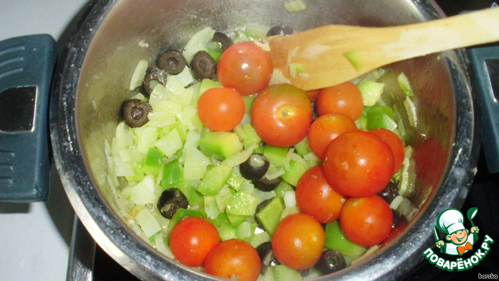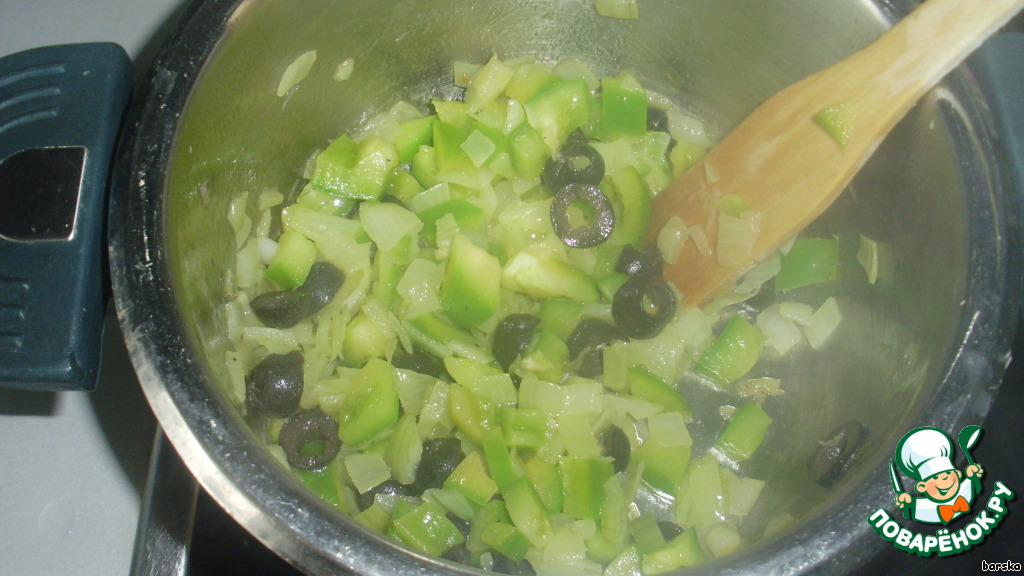 Обжарить на оливковом масле мелкорезанный лук и паприку