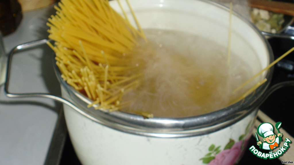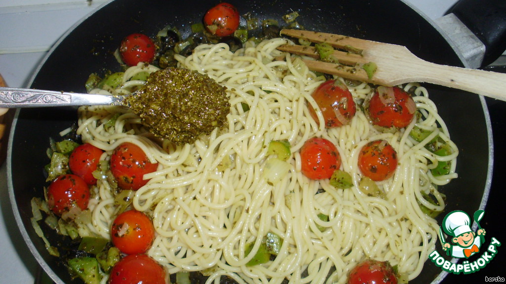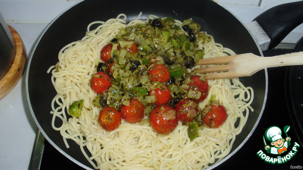 готовые спагетти выкладываем на сковородку, добавляем наш соус