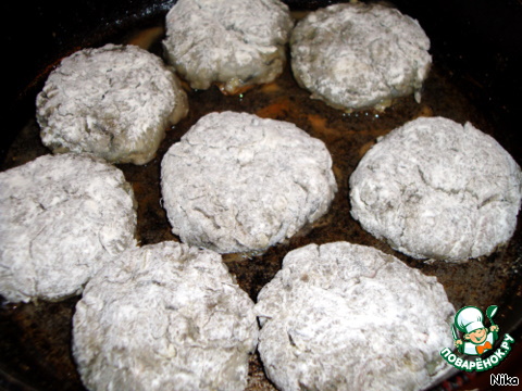 Формируем котлетки, обваливаем в муке и жарим в сковороде на растительном масле.