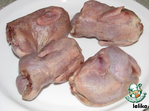 Перепелов разморозить и хорошенько промыть, удалить оставшиеся перья.