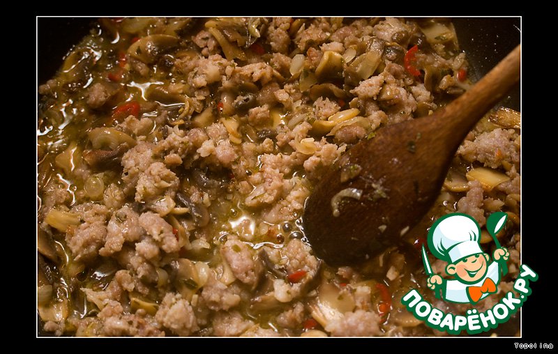 В рецепте этого шага не было, но я такая душа, алкогольная (а поживите в этой варварской стране хотя бы с моe, боюсь, тоже не уйдeте от этой участи)... одним словом, взяла я грех на душу — полила я немножко эту смесь белым винцом и выпарила из винца алкоголь.